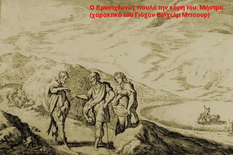 Πήγε και βρήκε την θεά Πείνα και την πρόσταξε να υποβάλλει τον άτυχο βασιλιά στο μαρτύριο της. Η Πείνα ήταν μια θεά άσχημη, γερασμένη, κίτρινη στην όψη και πολύ αδύνατη ενώ ζούσε απομονωμένη από όλους τους ανθρώπους ακόμα και τους Θεούς. Η Πείνα λοιπόν υπάκουσε αμέσως στην προσταγή της Δήμητρας και γρήγορα πήγε και βρήκε τον Ερυσίχθονα την ώρα που κοιμόταν. Αφού έσκυψε επάνω του φύσηξε μέσα στο στόμα του την αθάνατη πνοή της κι έτσι έκανε τον βασιλιά της Θεσσαλίας να πεινάει συνεχώς. Ο Ερυσίχθονας άρχισε να υποφέρει καθώς έβλεπε ότι η πείνα του δε μπορούσε να κορεστεί με κανένα τρόπο, όσο κι αν έτρωγε. Οι δούλοι του συνεχώς του έψηναν φαγητά όμως εκείνος δε μπορούσε να χορτάσει με τίποτα. Σύντομα άρχισε να χάνει όλο του το βιός για να μπορεί να έχει χρήματα ώστε να αγοράζει φαγητά κι αναγκάστηκε να πουλήσει το παλάτι του, τους δούλους του και στο τέλος πούλησε και την όμορφη μοναχοκόρη του, τη Μήστρα. Η Μήστρα είχε αγαπηθεί από τον Ποσειδώνα ο οποίος της είχε χαρίσει την ικανότητα να μεταμορφώνεται σε όποιο ζώο ήθελε. Η κοπέλα λοιπόν πολλές φορές πουλήθηκε από τον πατέρα της και μεταμορφωνόταν σε ζώο πηγαίνοντας έτσι κοντά του για να πουληθεί και πάλι. Μια μέρα η Μήστρα άργησε να πάει κοντά στον πατέρα της κι ο Ερυσίχθονας, νιώθοντας το μαρτύριο της ατελείωτης πείνας να τον βασανίζει επέβαλε στον εαυτό του τον πιο βασανιστικό, επώδυνο και ταπεινωτικό θάνατο.