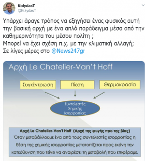 Σε μια πρόσφατη ανάρτησή μου στο Twitter έκανα μια αναφορά στη «αρχή της φυγής προ της βίας» ( αρχή Le Chatellier-Van’t Hoff) μια χημική διεργασία και έθετα το ερώτημα αν αυτή η αρχή που σχετίζεται με τις χημικές αντιδράσεις, μπορούσε να συνδέεται και με το σύγχρονο θέμα της κλιματικής αλλαγής. H αρχή αυτή αναφέρει ότι «όταν μεταβάλλουμε έναν από τους συντελεστές ισορροπίας, η θέση της χημικής ισορροπίας μετατοπίζεται προς εκείνη την κατεύθυνση που τείνει να αναιρέσει τη μεταβολή που επιφέραμε». Με άλλα λόγια έθετα το ερώτημα αν αυτή η άνοδος της θερμοκρασίας που «εμείς επιφέραμε» μήπως μας οδηγήσει σε πτώση της στο απώτερο μέλλον . Βέβαια αυτή η «πολυπόθητη ισορροπία» ενός πειράματος , δεν υπάρχει απόλυτα, σε ένα ανοιχτό σύστημα όπως είναι η γη. Εκεί όπου τα πάντα μεταβάλλονται συνεχώς και οι μορφές των πραγμάτων εναλλάσσονται όπως η φωτιά, ο πόλεμος και η έρις , όλες αυτές οι προσφιλείς έννοιες του Ηρακλείτου, που εκφράζουν την κοσμική αστάθεια και τη μεταλλαγή. Αυτές ουσιαστικά που εκφράζουν σε ένα μεγάλο βαθμό και την σημερινή κοινωνία, τις φυσικές διεργασίες και την πραγματικότητα. Για να αντιληφθεί κάποιος την αληθινή δομή της πραγματικότητας θα πρέπει πρώτα να απαλλαγεί από τις προκαταλήψεις και τις «βεβαιότητές» του.
