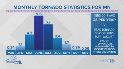 Όπως μπορούμε να παρατηρήσουμε στο παραπάνω γράφημα η μεγαλύτερη συχνότητα εμφανίζεται τους ανοιξιάτικους και πρώτους καλοκαιρινούς μήνες. Οι ανεμοστρόβιλοι εμφανίζονται συνήθως κατά τη διάρκεια της ημέρας, όμως υπάρχουν και νυχτερινοί ανεμοστρόβιλοι. Κάθε φορά που εκδηλώνεται μια έντονη καταιγίδα, υπάρχει το ενδεχόμενο να δημιουργηθεί ανεμοστρόβιλος. Οι νυχτερινοί ανεμοστρόβιλοι μπορούν να είναι ιδιαίτερα επικίνδυνοι επειδή είναι δύσκολο να τους διακρίνουμε .
