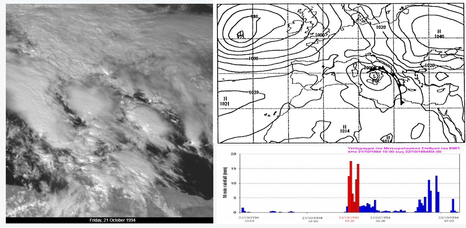 Αν δούμε την παραπάνω δορυφορική , καθώς και την ανάλυση του χάρτη, θα παρατηρήσουμε οτι όλη αυτή κατάσταση προκλήθηκε από ένα κυκλωνικό σύστημα με ψυχρό μέτωπο που σχηματίστηκε στην Ιταλία και κινήθηκε ανατολικά. Όπως φαίνεται στις 21/10/1994 και ώρα 18:00 UTC, το χαμηλό κέντρο του συστήματος με πίεση 994 hPa ήταν εγκατεστημένο μεταξύ Ιταλίας και Σικελίας, ενώ το ψυχρό μέτωπο προχωρούσε προς το Ιόνιο Πέλαγος και την Ελληνική Χερσόνησο. Ταυτόχρονα, ένα εκτεταμένο σύστημα με υψηλές πιέσεις των 1040 hPa ήταν εγκατεστημένο στην Κεντρική Ρωσία. Οι παραπάνω δορυφορικές παρατηρήσεις από την περιοχή της Αθήνας στις 12:00 UTC δείχνουν για όλη την τροπόσφαιρα ένα περιβάλλον σχεδόν κορεσμένο.