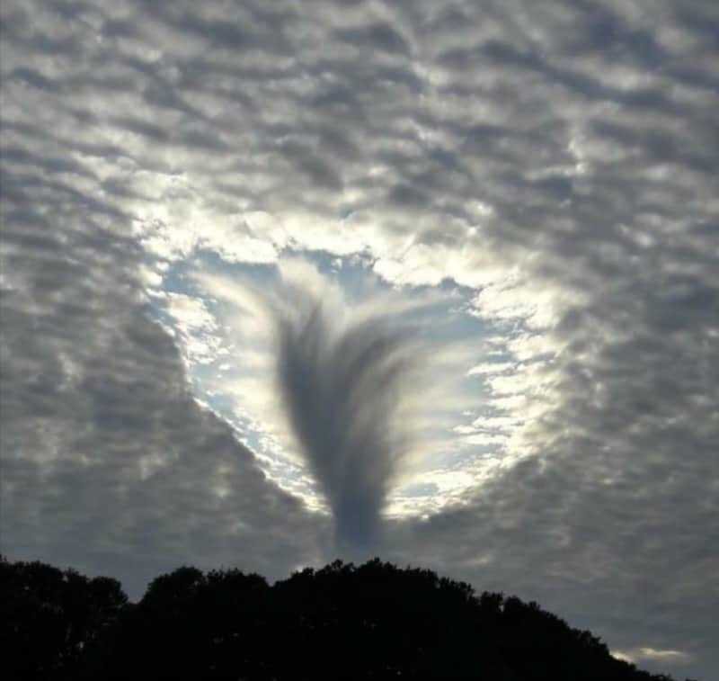 Kαταπληκτικός σχηματισμός με την διεθνή ονομασία «Fallstreak Hole” κατεγράφη στις 19 Οκτωβρίου 2019 από τον Marco Beric στη Γερμανία. O παράξενος σχηματισμός μπορεί να εμφανιστεί σε νέφη Cirrocumulus η σε Altocumulus. Τέτοιες οπές σχηματίζονται όταν η θερμοκρασία του νερού στα σύννεφα είναι κάτω από το μηδέν, αλλά το νερό δεν έχει παγώσει ακόμη, λόγω της έλλειψης πυρήνων παγοποίησης (νερό σε υπέρτηξη). Όταν οι παγοκρύσταλλοι αρχίζουν να δημιουργούνται, τότε πυροδοτείται μια επίδραση ντόμινο, λόγω της διαδικασίας Bergeron με αποτέλεσμα τα σταγονίδια νερού γύρω από τους κρυστάλλους να εξατμιστούν. Αυτό αφήνει μια μεγάλη, συχνά κυκλική, τρύπα στο σύννεφο.