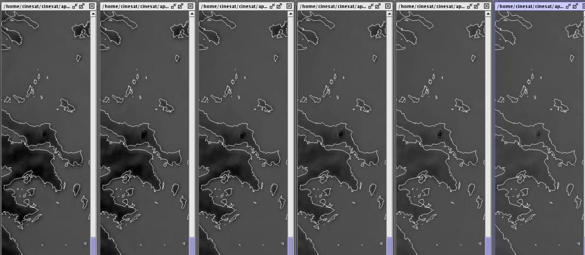 Η εξέλιξη της πυρκαγιάς αποτυπώνεται στις παραπάνω δορυφορικές φωτογραφίες , όπου το «θερμό» περιβάλλον της περιοχής διακρίνεται από το έντονα μαύρο σκούρο χρώμα της φωτιάς. Αν κοιτάξουμε με προσοχή την Αθήνα θα διακρίνουμε το σκούρο χρώμα της θερμικής νησίδας πάνω από την πόλη της Αθήνας που διακρίνεται καλύτερα τις πρώτες απογευματινές ώρες που η θερμοκρασία ήταν υψηλότερη. Προς το βράδυ αυτή θερμοκρασιακή αντίθεση δεν είναι τόσο εμφανής.
