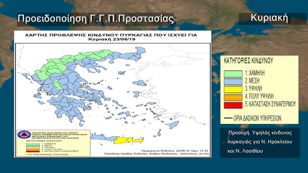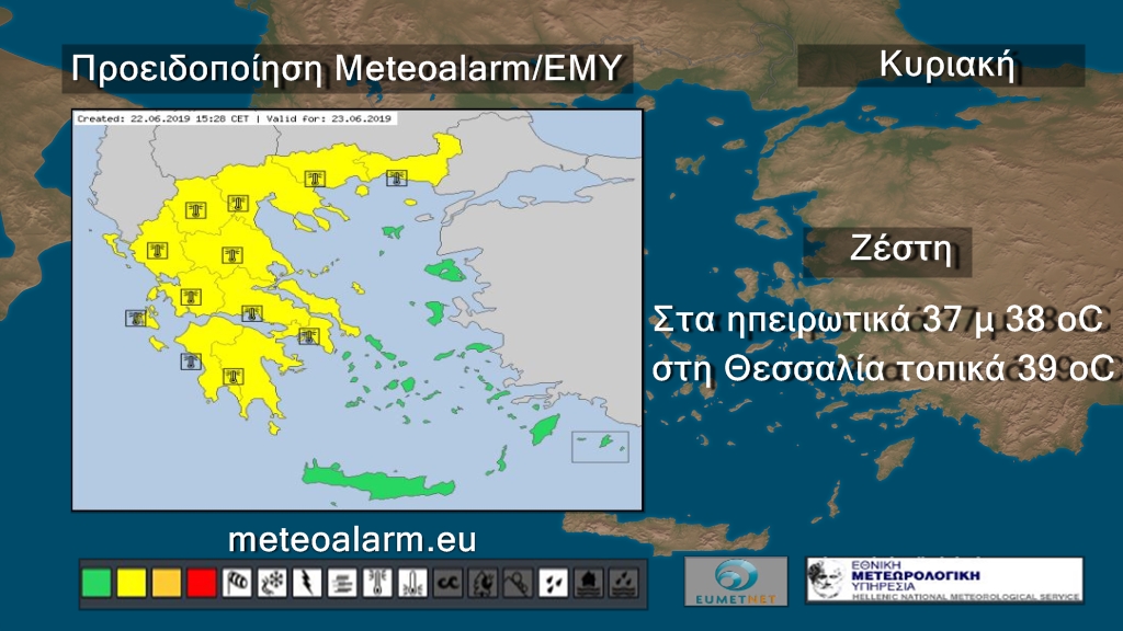 Αισθητή άνοδος της θερμοκρασίας την Κυριακή σε όλα τα ηπειρωτικά με τον υδράργυρο να φτάνει τους 37 με 38 και τοπικά στη Θεσσαλία τους 39 βαθμούς Κελσίου. Τοπικά υψηλή κατηγορία κινδύνου για πυρκαγιές στο Νομό Ηρακλείου και Λασιθίου σύμφωνα με την πρόγνωση της Γενικής Γραμματείας Πολιτικής Προστασίας.